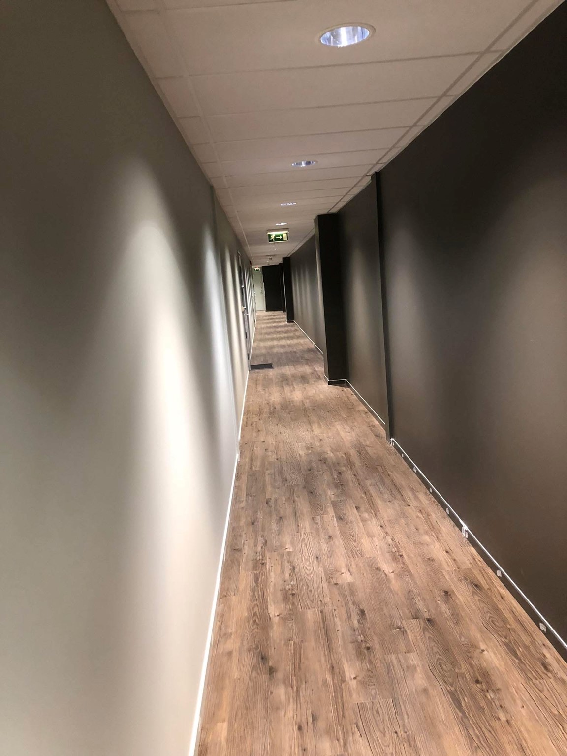 Innvendig oppfriskning av lange kontorganger. Bruk av nøytrale, moderne farger for et profesjonelt miljø, kombinert med slitesterk maling for høy trafikk.
